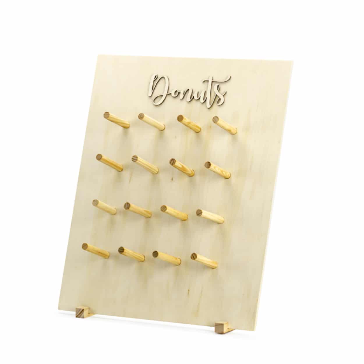 Le présentoir comporte 16 pics en bois pour y glisser vos donuts. Selon leur taille vous pouvez mettre 2 donuts par pic, soit 32 donuts.