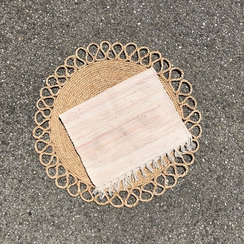 Un joli tapis dans les tons rose. Utilisez le pour y disposer par terre avec un assortiment d’autres tapis pour un pique nique.
