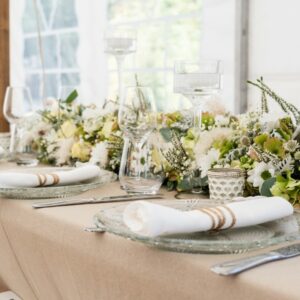 - En location : Nappe 100% lin naturel, nettoyage inclus. Une jolie façon d'habiller vos tables et de mettre en valeur votre décoration champêtre/nature. Dimensions : Environ 166 x 273 cm